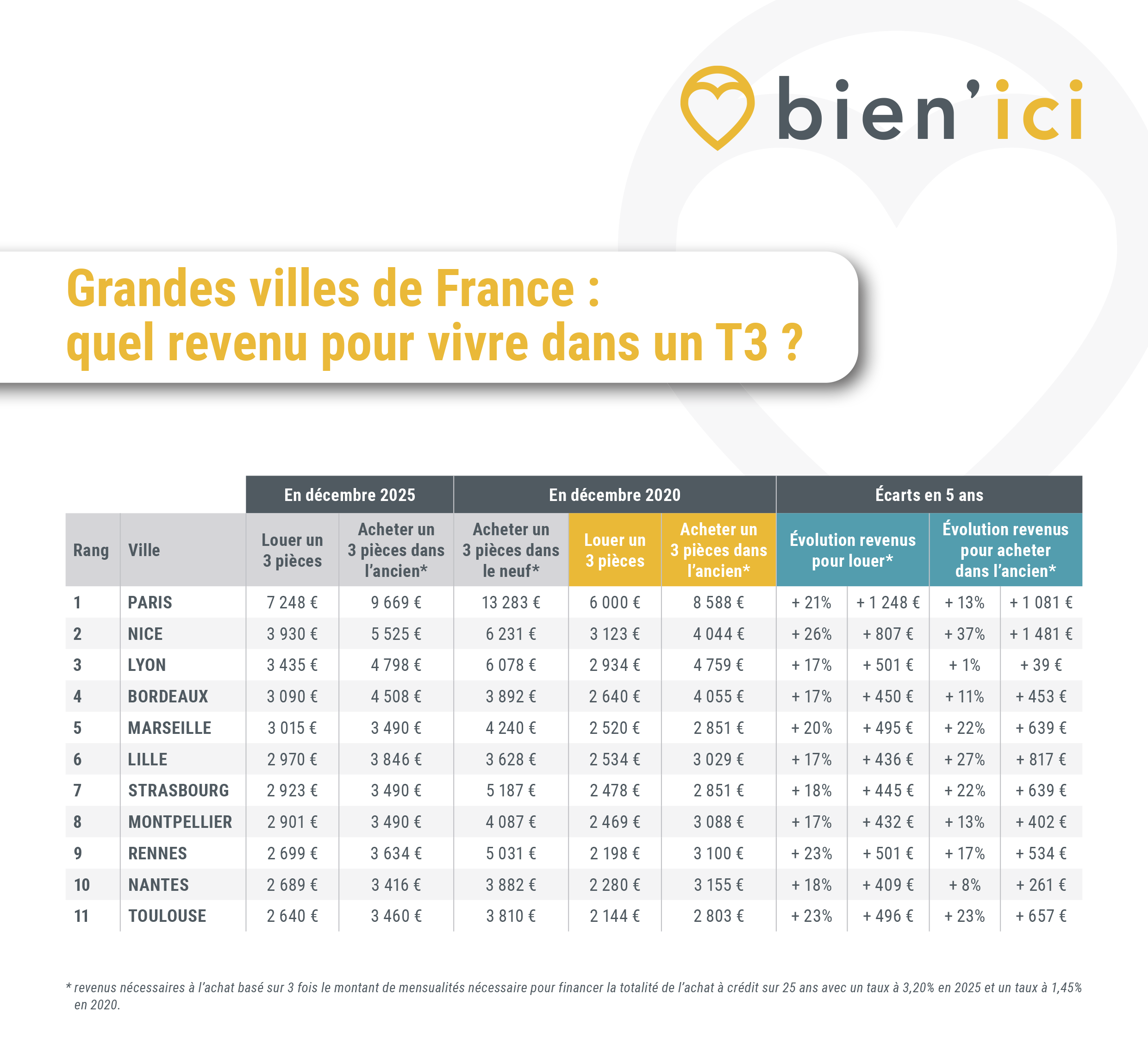 En s’appuyant sur des dizaines de milliers d’annonces, Bien’ici, la plateforme d'annonces immobilières, mesure le pouvoir immobilier réel des ménages dans les 11 plus grandes villes françaises, du studio au T5. L’étude montre une France des grandes villes très contrastée, avec un Paris toujours très largement hors catégorie, loin devant Nice, Lyon ou Bordeaux, tandis que Toulouse, Nantes ou Rennes restent relativement plus accessibles. En réalisant un focus sur les 3-pièces, elle révèle surtout qu’en cinq ans il faut désormais beaucoup plus de revenus pour louer ou acheter la même surface (*1).
